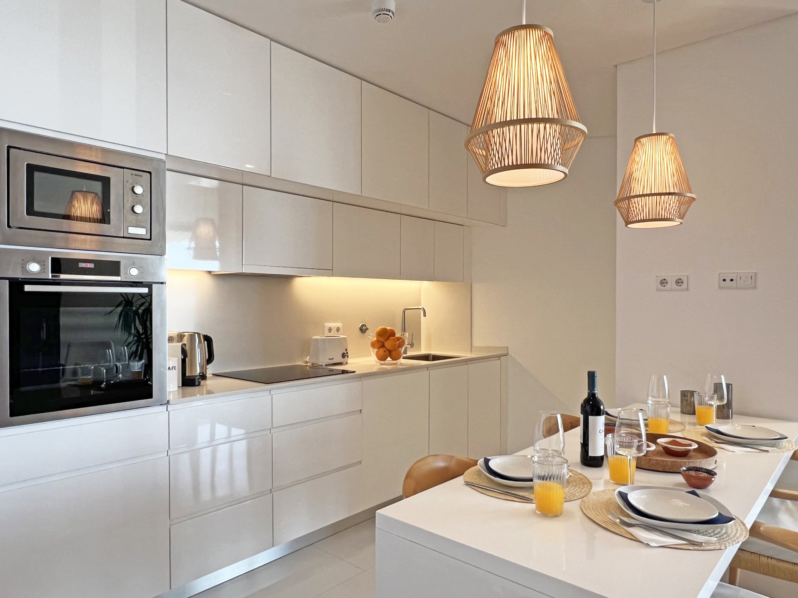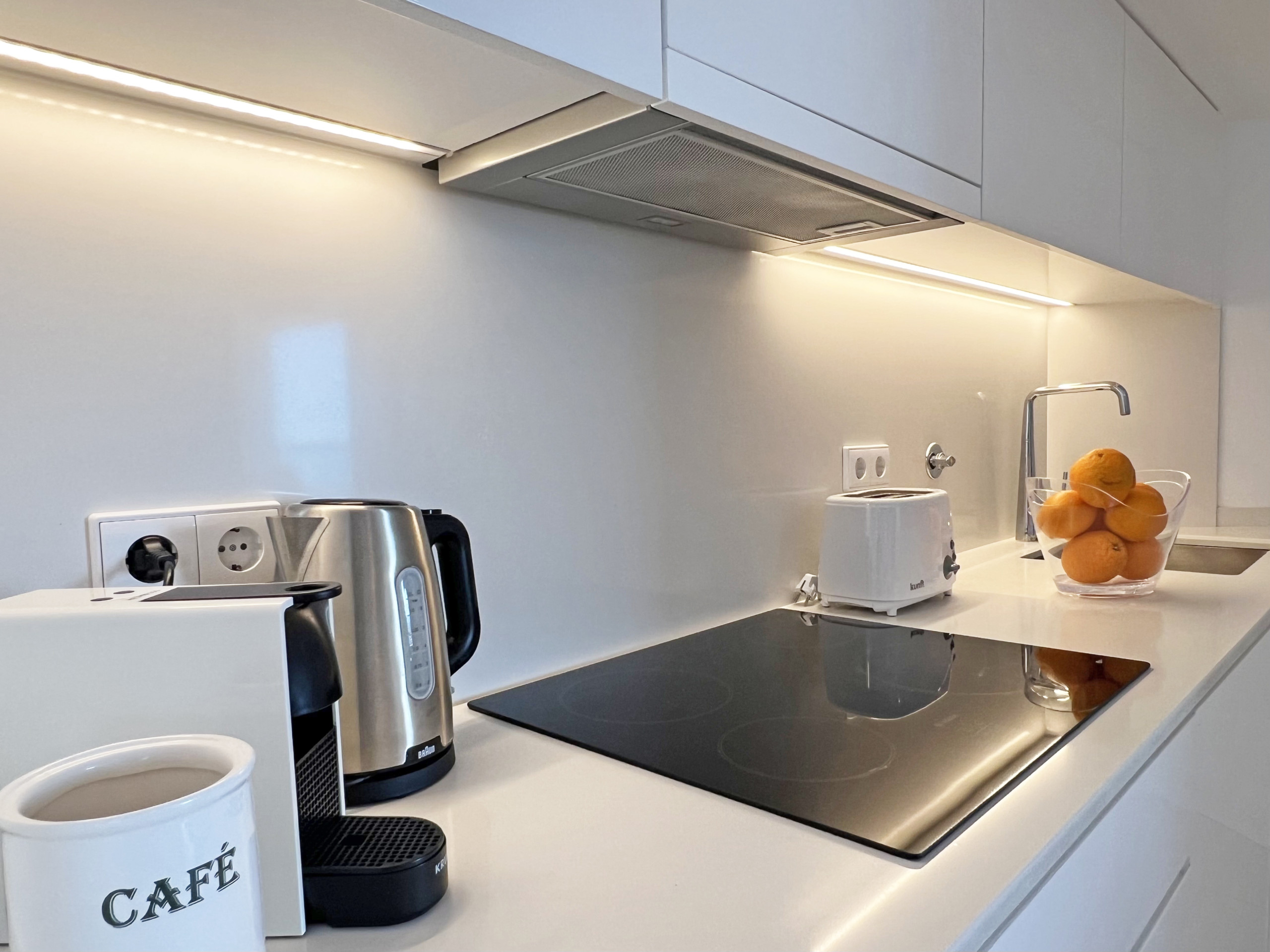 A kitchenette, de inducção, está equipada com frigorífico, microondas, forno, congelador, máquina de lavar louça, louça/talheres, utensílios/cozinha, máquina de café, torradeira e jarro eléctrico.