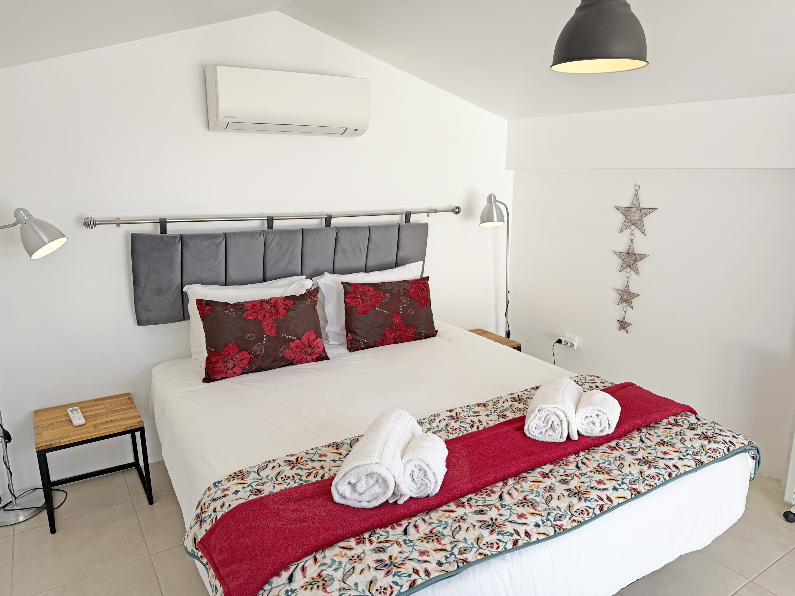 -> 1 Confortável e acolhedor quarto em suite com 1 cama de casal, casa de banho, Ar Condicionado e acesso a um pequeníssimo e singular pátio interior;