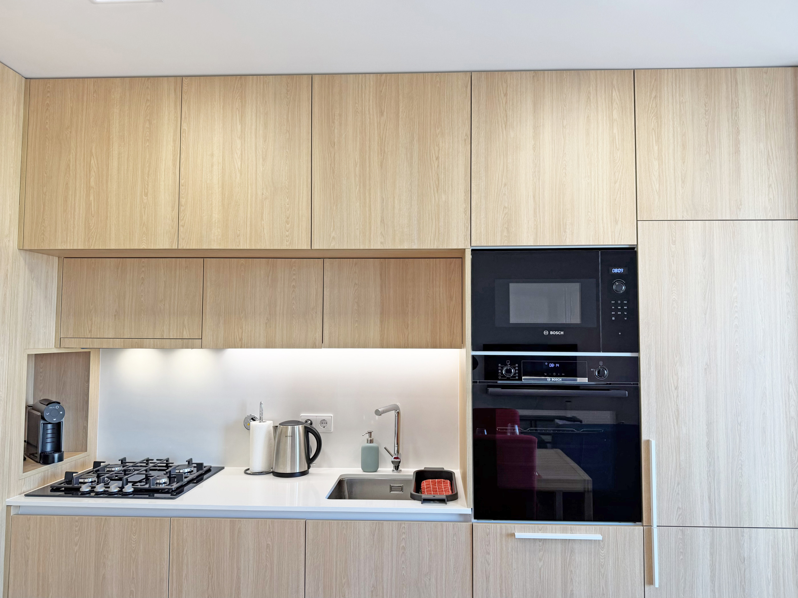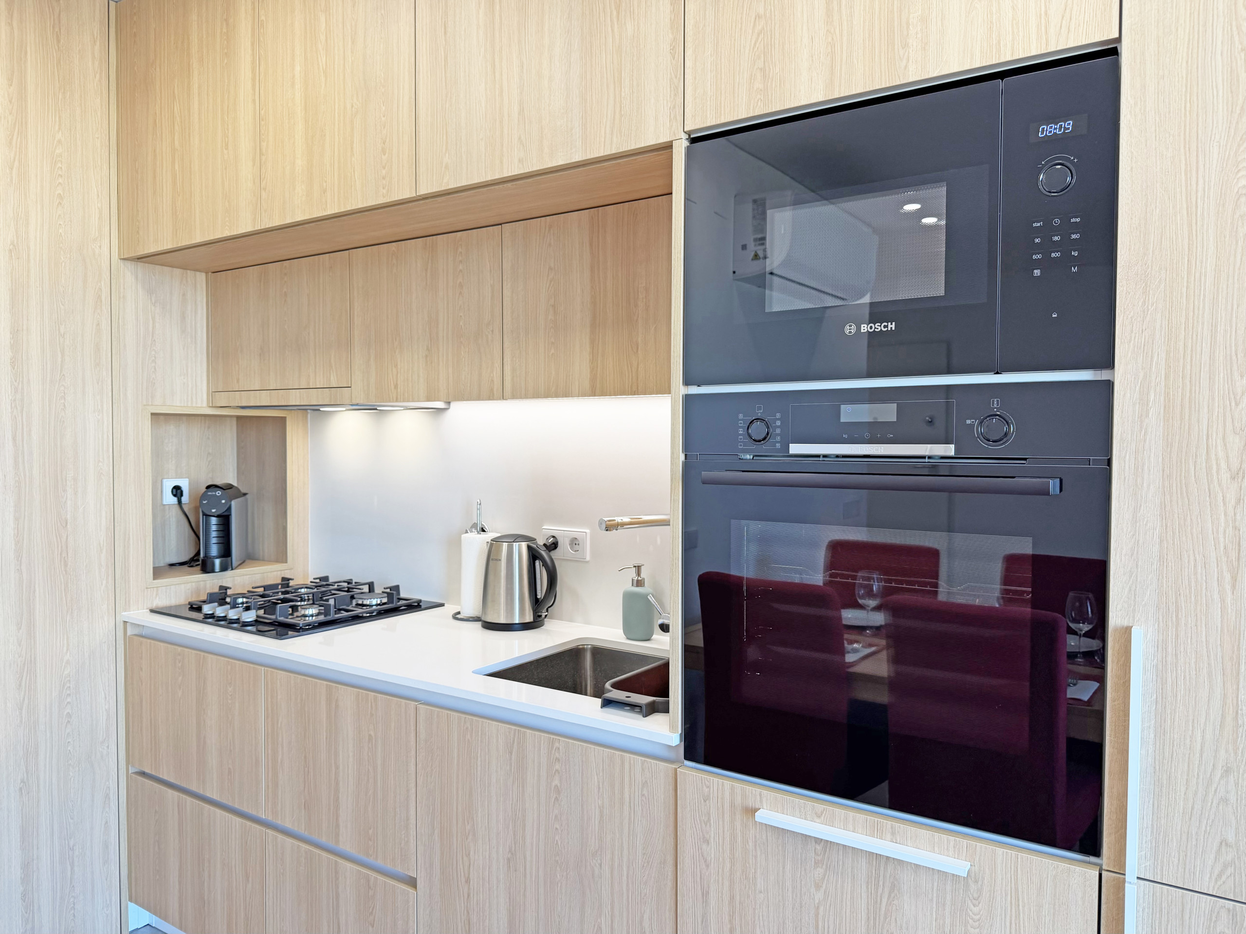 the kitchen, refrigerator, microwave, oven, freezer, dishwasher, dishes/cutlery, kitchen utensils, coffee machine, toaster and kettle are provided.
